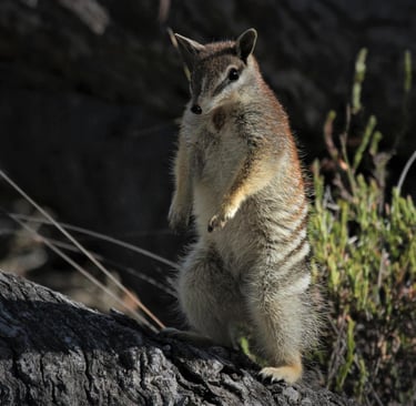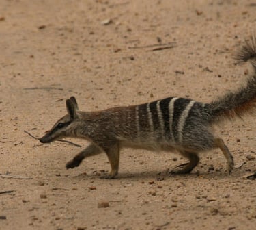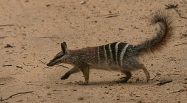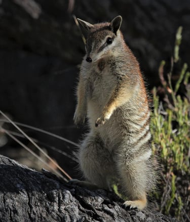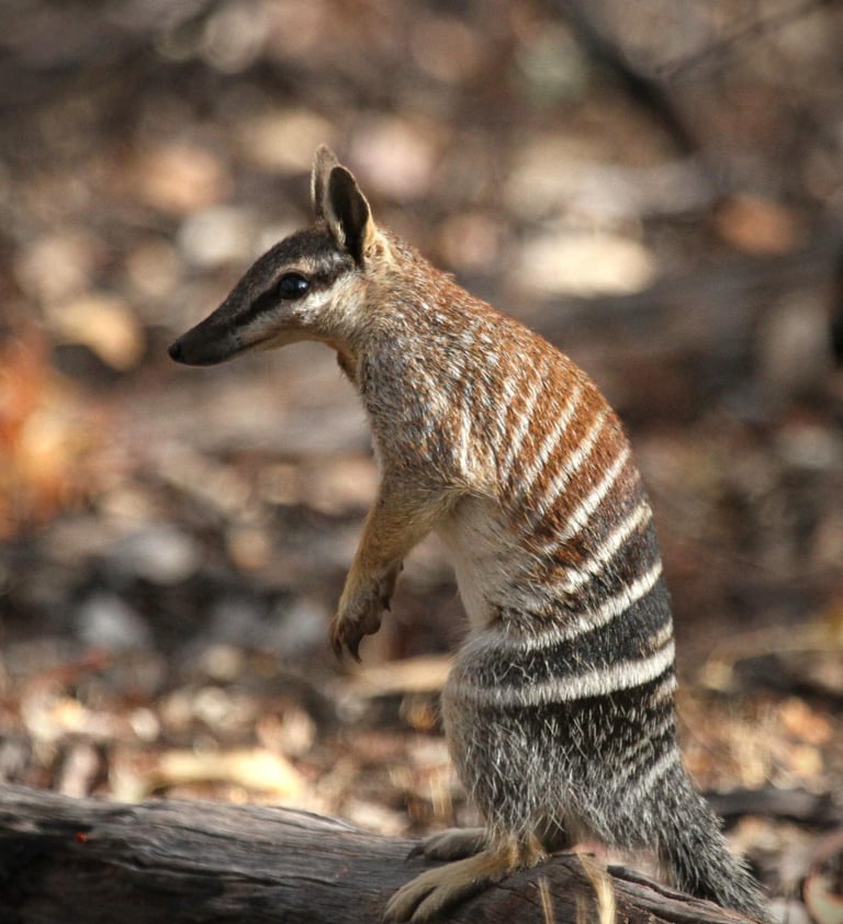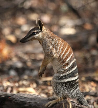 The Numbat (Myrmecobius fasciatus) is a species of small, insectivorous marsupial. With its striking bands across its back, observing pose like a meerkat, the lifestyle of an anteater and a mask like a bandit, the numbat is one of the most charismatic animals of the Australian bush.